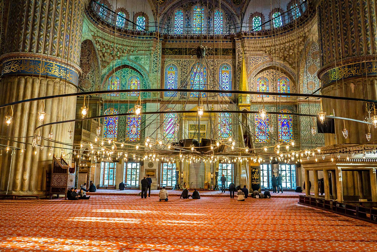 - استكشف تصميم الجامع الداخلي، المُزيّن بأكثر من 20 ألف بلاطة باللونين الأزرق والفيروزي من بلاط الإزنيق، والتي تعكس الضوء الطبيعي المنبعث من أكثر من 260 نافذة زجاجية ملونة.