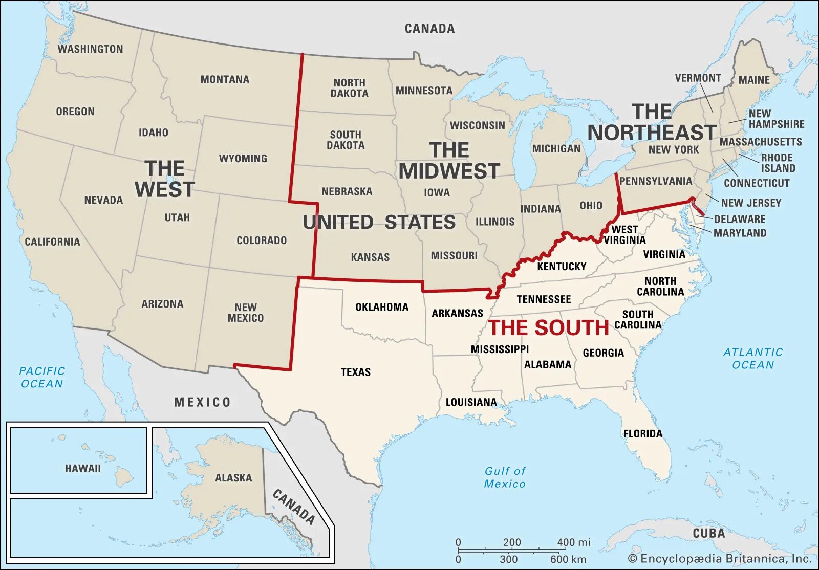 تُقسّم الولايات المتحدة الأمريكية عادةً إلى أربع مناطق جغرافية، والتي تُسهم في تشكيل تضاريس البلاد الشاسعة، وثقافاتها المتنوعة، وأنماطها الاقتصادية المتباينة. تُصنّف هذه التقسيمات غالبًا في مناطق أكبر تشترك في أوجه تشابه في التاريخ والمناخ والثقافة والاقتصاد. مناطق التقسيم الرئيسية الأربع هي الشمال الشرقي، والغرب الأوسط، والجنوب، والغرب، وتضم كل منها مناطق فرعية أصغر تعكس هويات جغرافية وثقافية فريدة.