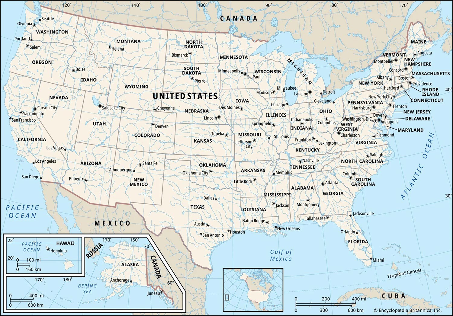 تقع الولايات المتحدة الأمريكية في قارة أمريكا الشمالية، تحدها من الشمال كندا، ومن الجنوب المكسيك، ويحدها من الشرق المحيط الأطلسي، ومن الغرب المحيط الهادئ. تبلغ مساحة الولايات المتحدة الأمريكية (ثالث أكبر دولة من حيث المساحة بعد روسيا وكندا) 9.83 مليون كيلومتر مربع. وتضم الولايات المتحدة 50 ولاية، بالإضافة إلى مقاطعة كولومبيا. تقع معظمها (48 ولاية وواشنطن العاصمة) في وسط أمريكا الشمالية بين المحيط الهادئ والمحيط الأطلسي. وعددًا من الأراضي والجزر في الكاريبي والمحيط الهادئ. بينما تقع ولاية ألاسكا في الشمال الغربي من القارة. وتُعد ولاية ألاسكا الشمالية أكبر الولايات، حيث تغطي 17% من المساحة. فيما تعتبر ولاية رود أيلاند أصغر الولايات بمساحة 2486 كيلومترًا مربعًا.