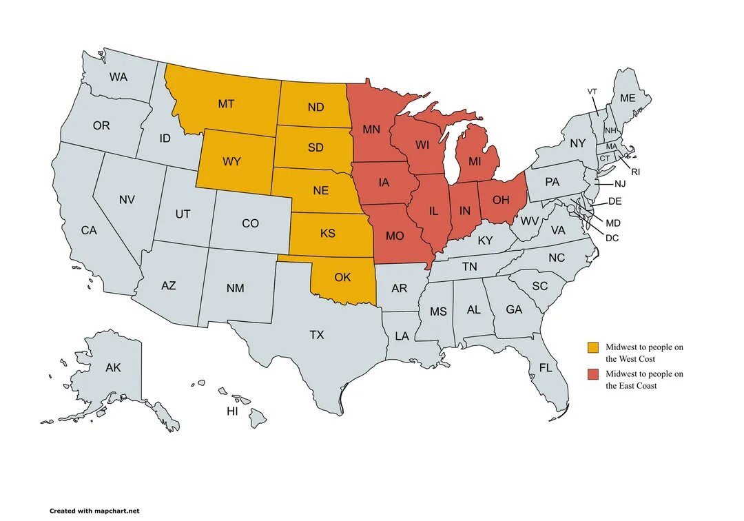 يتضمن الغرب الأوسط في الولايات المتحدة الأمريكية 12 ولاية، وهما أوهايو، وإنديانا، وإلينوي، وميشيغان، وويسكونسن، ومينيسوتا، وأيوا، وميسوري، وداكوتا الشمالية، وداكوتا الجنوبية، ونبراسكا، وكانساس. ويتميز بالسهول والمراعي الكبرى (داكوتا الشمالية، وداكوتا الجنوبية، ونبراسكا، وكانساس، وغرب مينيسوتا، وغرب أيوا). والبحيرات العظمى الأربع التي تحد أربع ولايات الغرب الأوسط: سوبيريور، وميشيغان، وهورون، وإيري. بينما يتدفق عبر المنطقة نهر المسيسيبي (شريان المنطقة)، ونهر ميسوري (أطول أنهار الولايات المتحدة)، ونهر أوهايو (يفصل الغرب الأوسط عن الجنوب)، ونهر إلينوي (يربط بين شيكاغو ونهر المسيسيبي). والغابات الكثيفة في شمال مينيسوتا، ويسكونسن، وميشيغان. ويسود المنطقة مناح قاري رطب غالبًا، وشتاء بارد، وصيف حار، وثلوج كثيفة في المناطق الشمالية، وعواصف في الشرق.