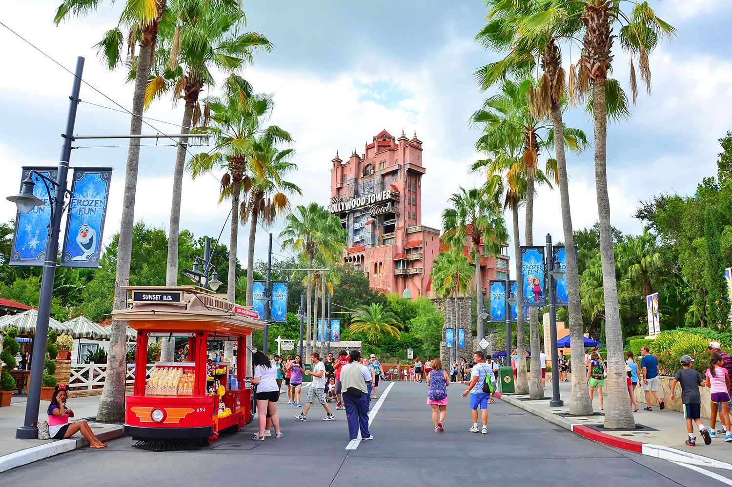 تمتد استديوهات هوليوود في عالم والت ديزني على مساحة 135 فدانًا، وتضم ست مناطق رئيسية: بوليفارد هوليوود، وبحيرة الصدى، وشوارع أمريكا، ومنطقة بيكسار، وفناء الرسوم المتحركة، وبوليفارد مغيب الشمس. تركز جميعها على التجارب التفاعلية والعروض المستوحاة من الأفلام والمسلسلات الهوليودية الشهيرة. وتمزج بين الفن والمغامرة والألعاب المثيرة. ومن أبرز ألعاب استوديوهات هوليوود، حرب النجوم، وميلينيوم فالكون، وأفعوانية الكلب السلينكي، وبرج الرعب المخيف، وسكة حديد ميكي وميني. بالإضافة إلى عرض موسيقي احتفالي مستوحى من فيلم فروزن، وعرض الجميلة والوحش الموسيقي الحي.